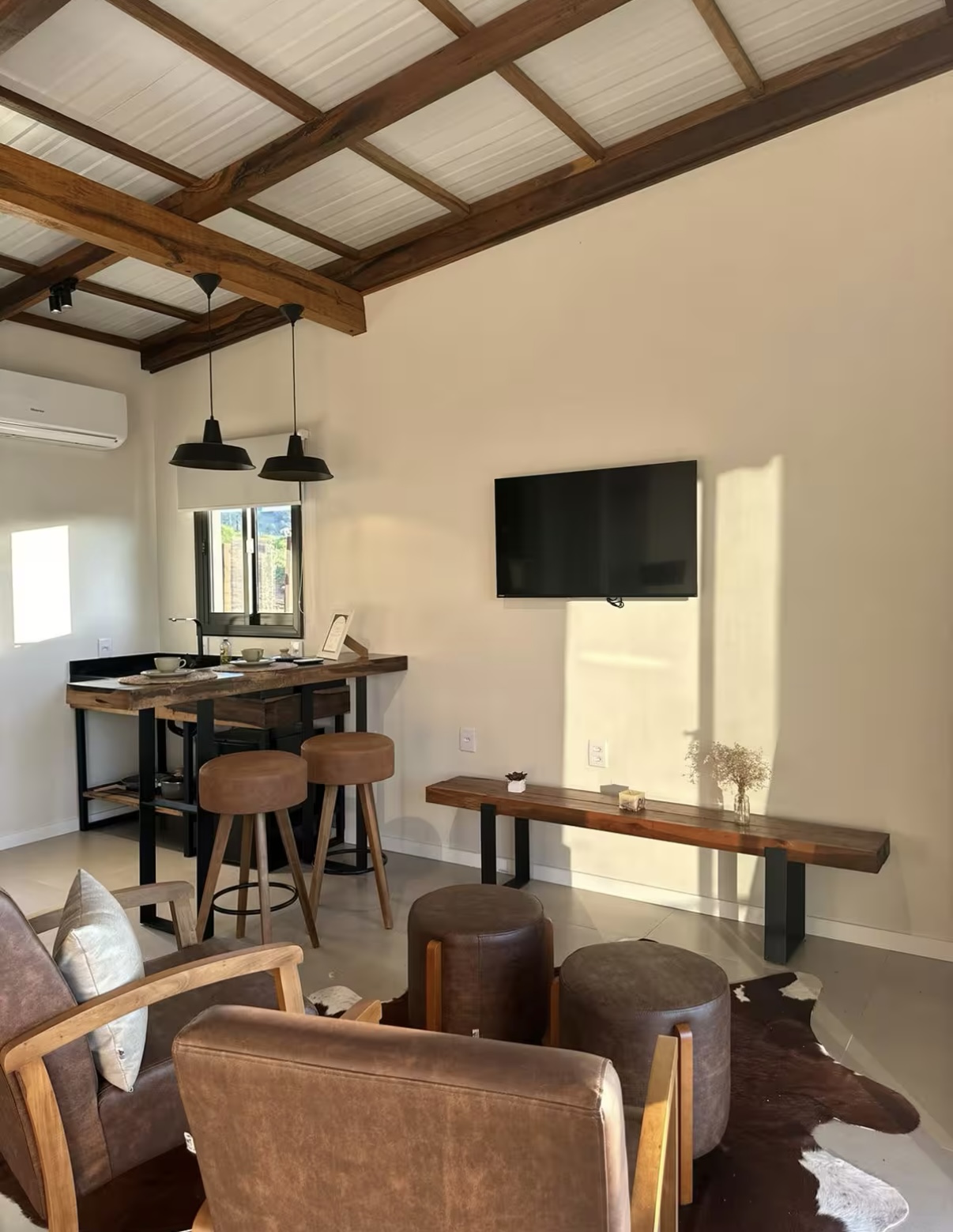 O espaço conta ainda com cozinha completa, proporcionando liberdade para preparar refeições no próprio ritmo. Um refúgio onde o tempo desacelera e a essência da natureza envolve cada momento, tornando a estadia uma experiência única de conexão e bem-estar.