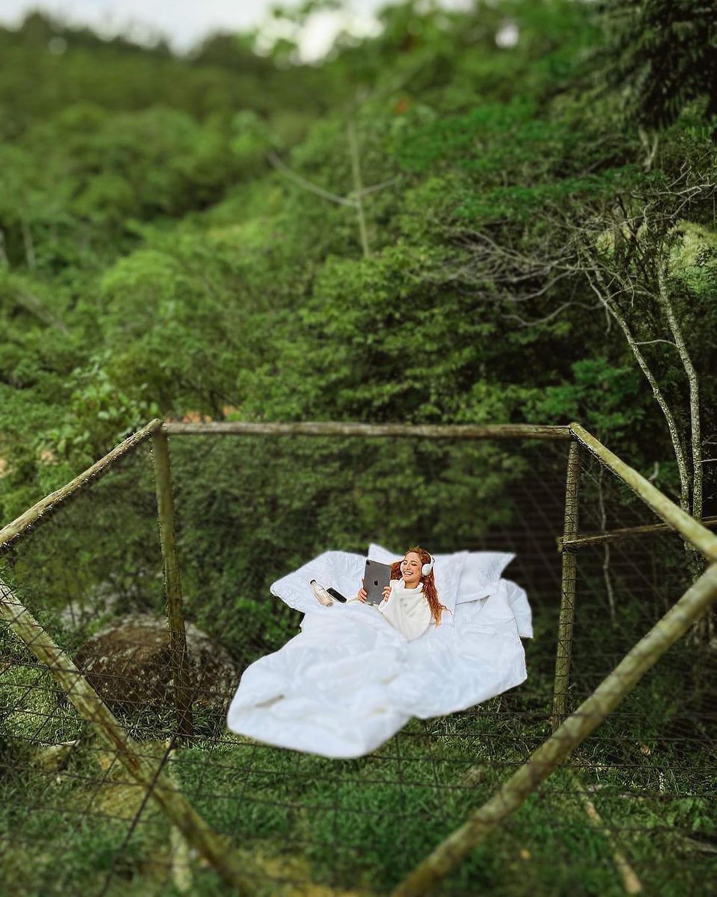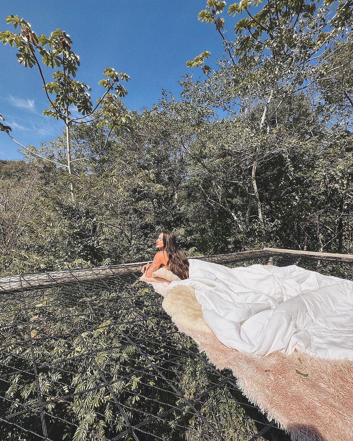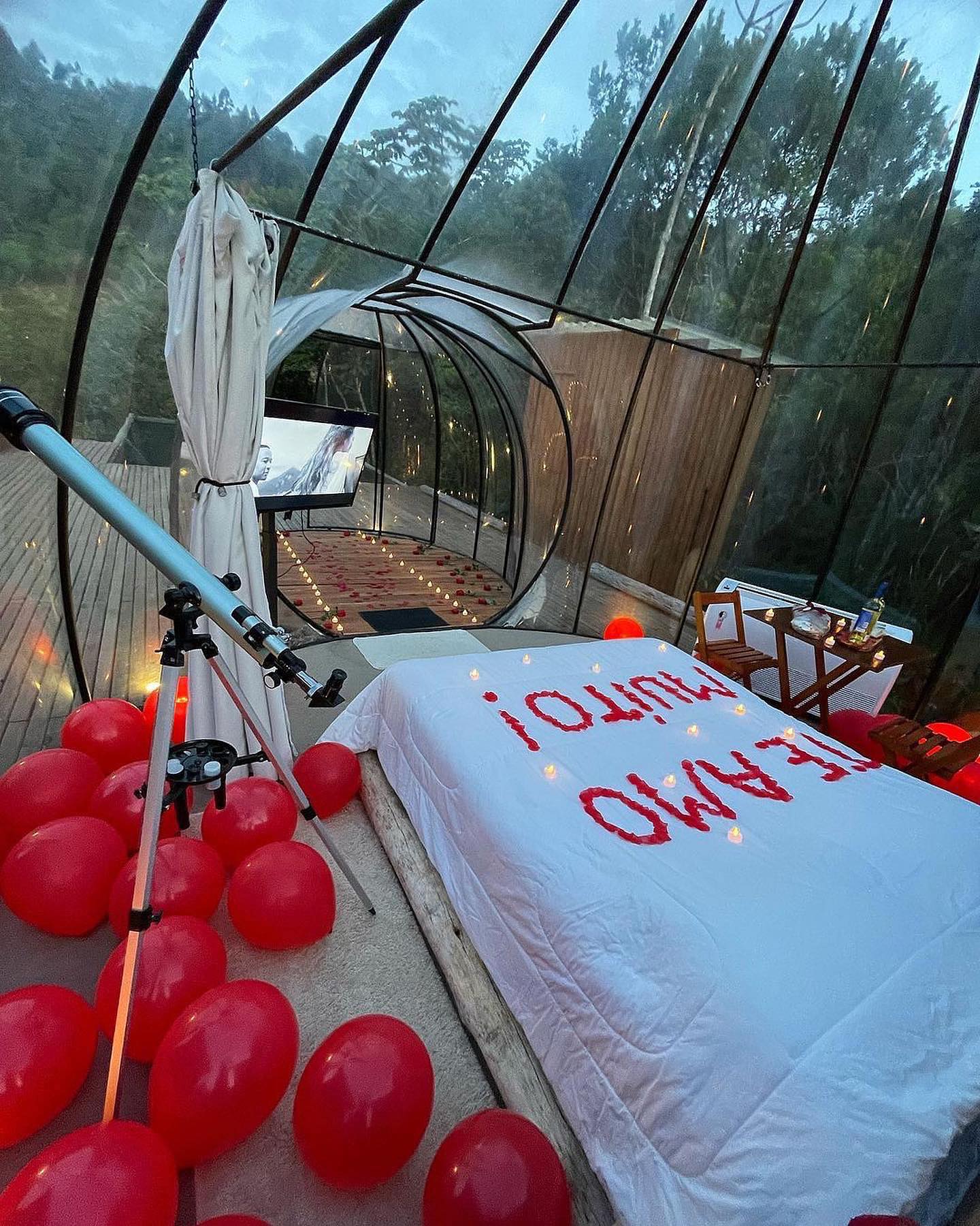 O espaço também dispõe de café da manhã que pode ser servido tanto na bolha, como também no voal. Possui um um banheiro com chuveiro a gás e vista para natureza. Uma hidro com guarda sol para ser curtida qualquer hora do dia. Curta a rede de 6 metros para ler um livro ouvindo o canto dos pássaros e registre sua foto no balanço iluminado de 6 metros de altura. Na parte da noite olhe as estrelas através do telescópio e aproveite cada momento da sua estadia.