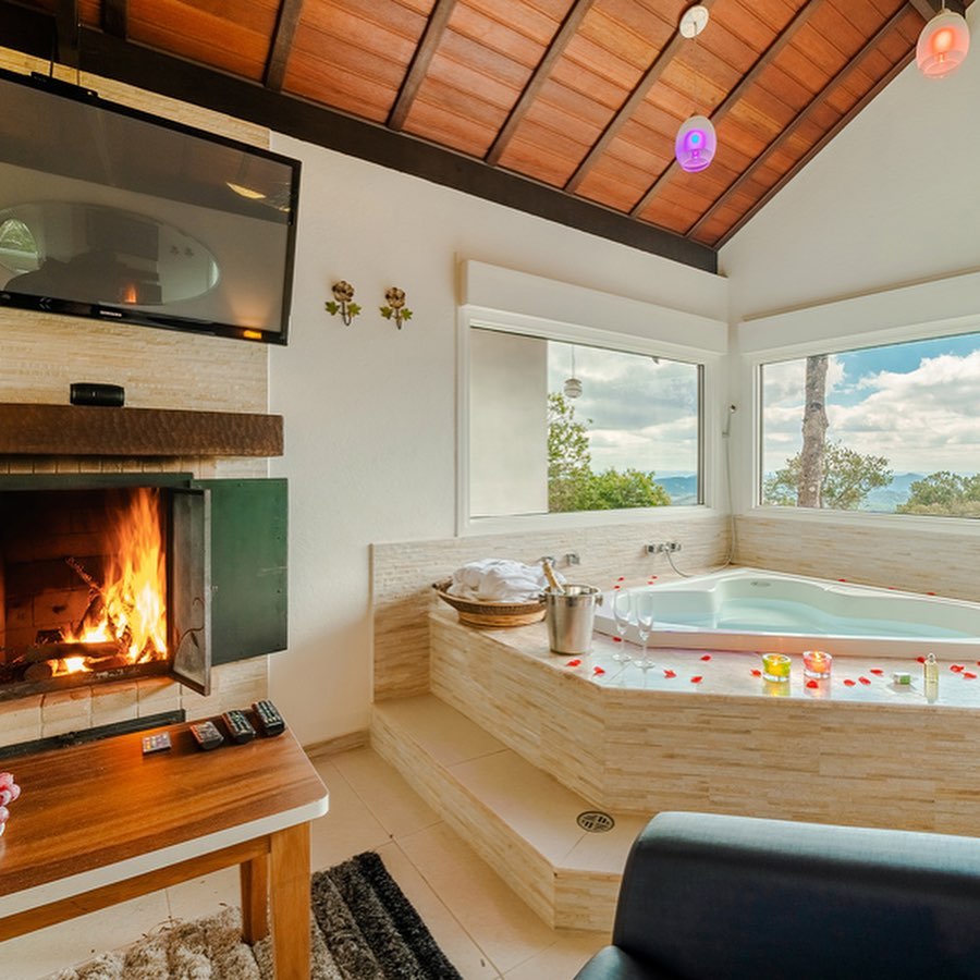 São 5 Chalés Pet Friendly com banheira de hidromassagem dupla que proporcionam um ambiente romântico com lareira, varanda, garantindo uma estada inesquecível.