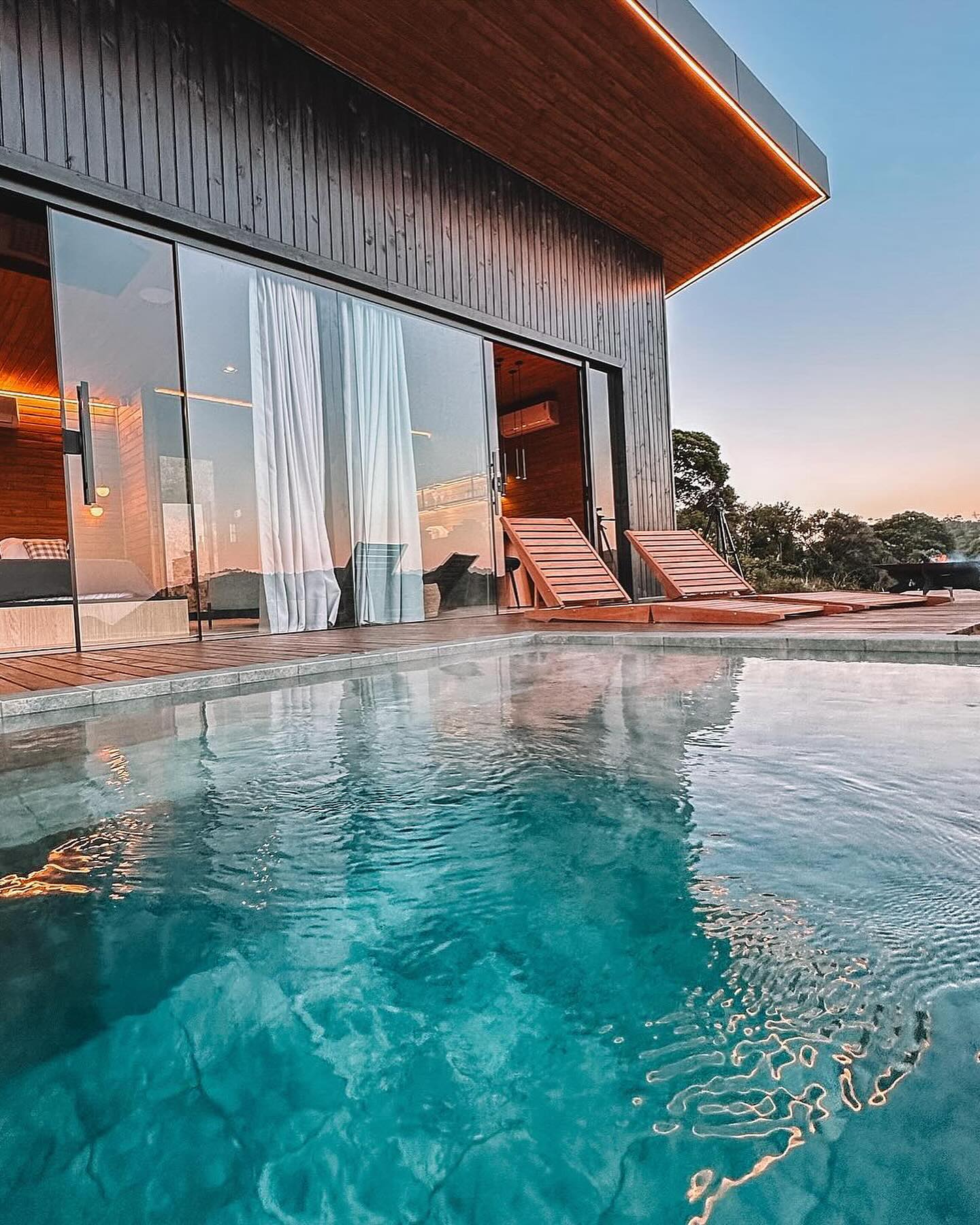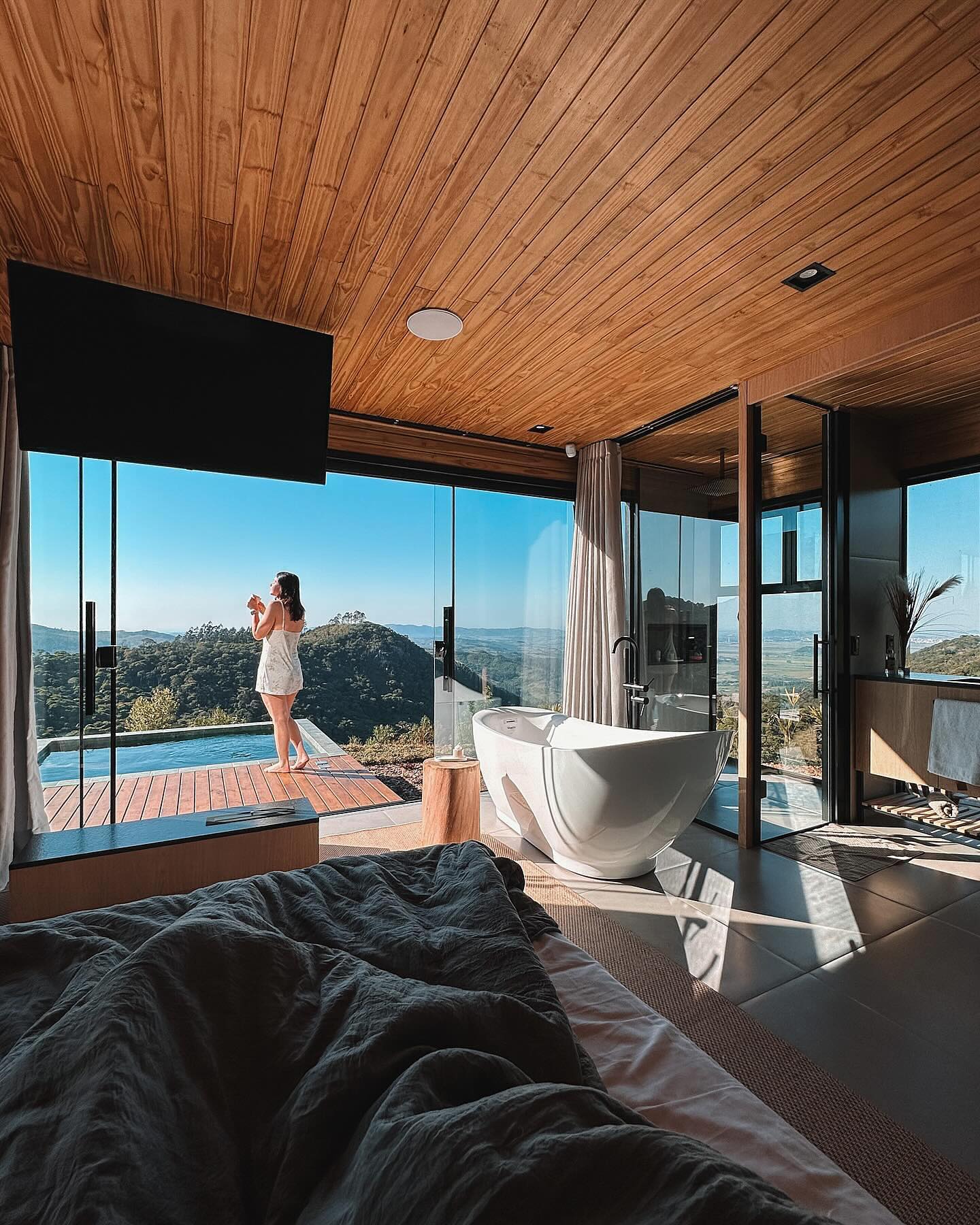 A área externa oferece piscina climatizada, deck com espreguiçadeiras, fire pit e espaço para apreciar o pôr do sol com vinho ao ar livre. No banho, escolha entre a banheira de imersão ou a ducha com efeito chuva, ambas com vista marcante e amenities de alto padrão. Um refúgio onde o tempo desacelera e cada detalhe foi pensado para criar memórias autênticas e momentos de reconexão em meio à paisagem inspiradora.