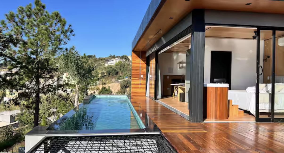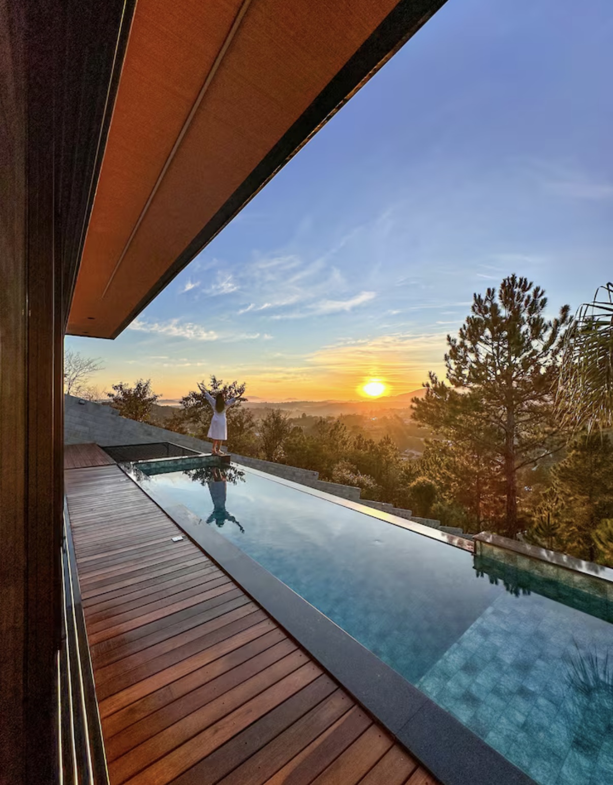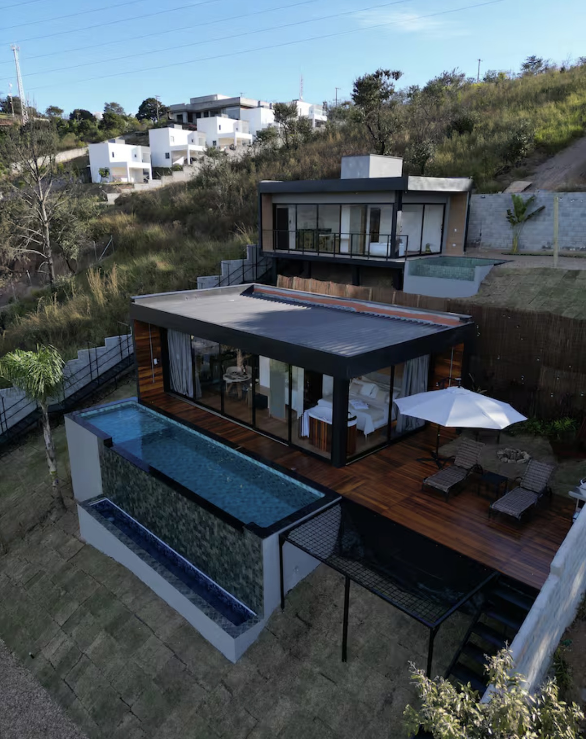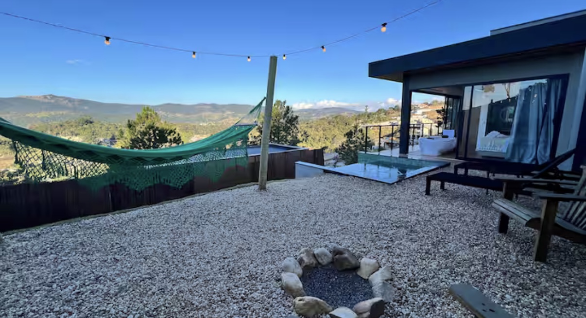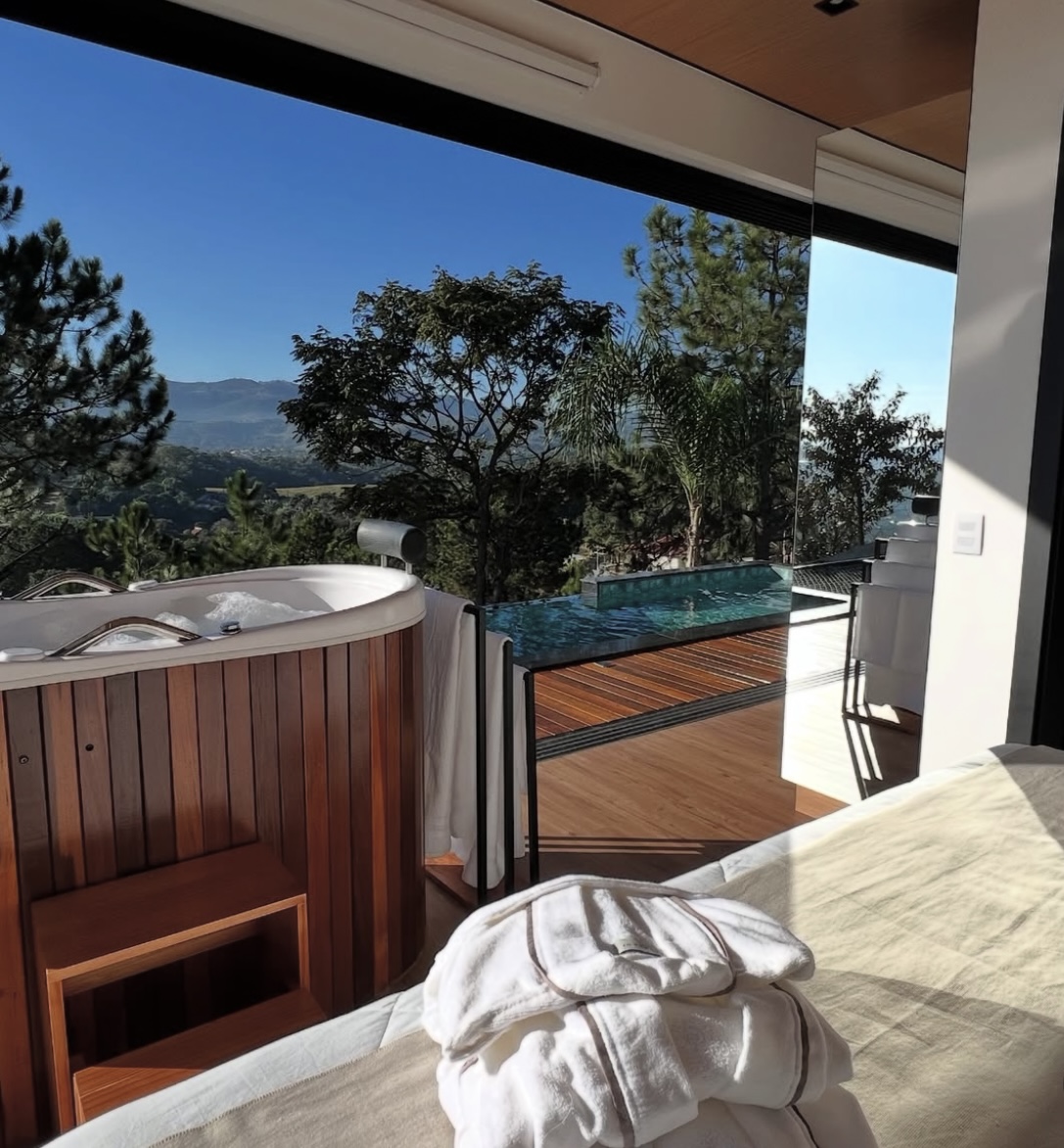 Esta cabana luxuosa oferece uma estadia exclusiva em meio à natureza, com vista panorâmica e infraestrutura completa para relaxamento e conforto. A estrutura conta com piscina aquecida de borda infinita, ofurô com cromoterapia, lareira externa, cama suspensa, lounge com deck de madeira, espreguiçadeiras e churrasqueira americana a gás. A arquitetura moderna valoriza o contato com o ambiente natural, criando um refúgio ideal para momentos a dois ou vivências memoráveis em total privacidade.