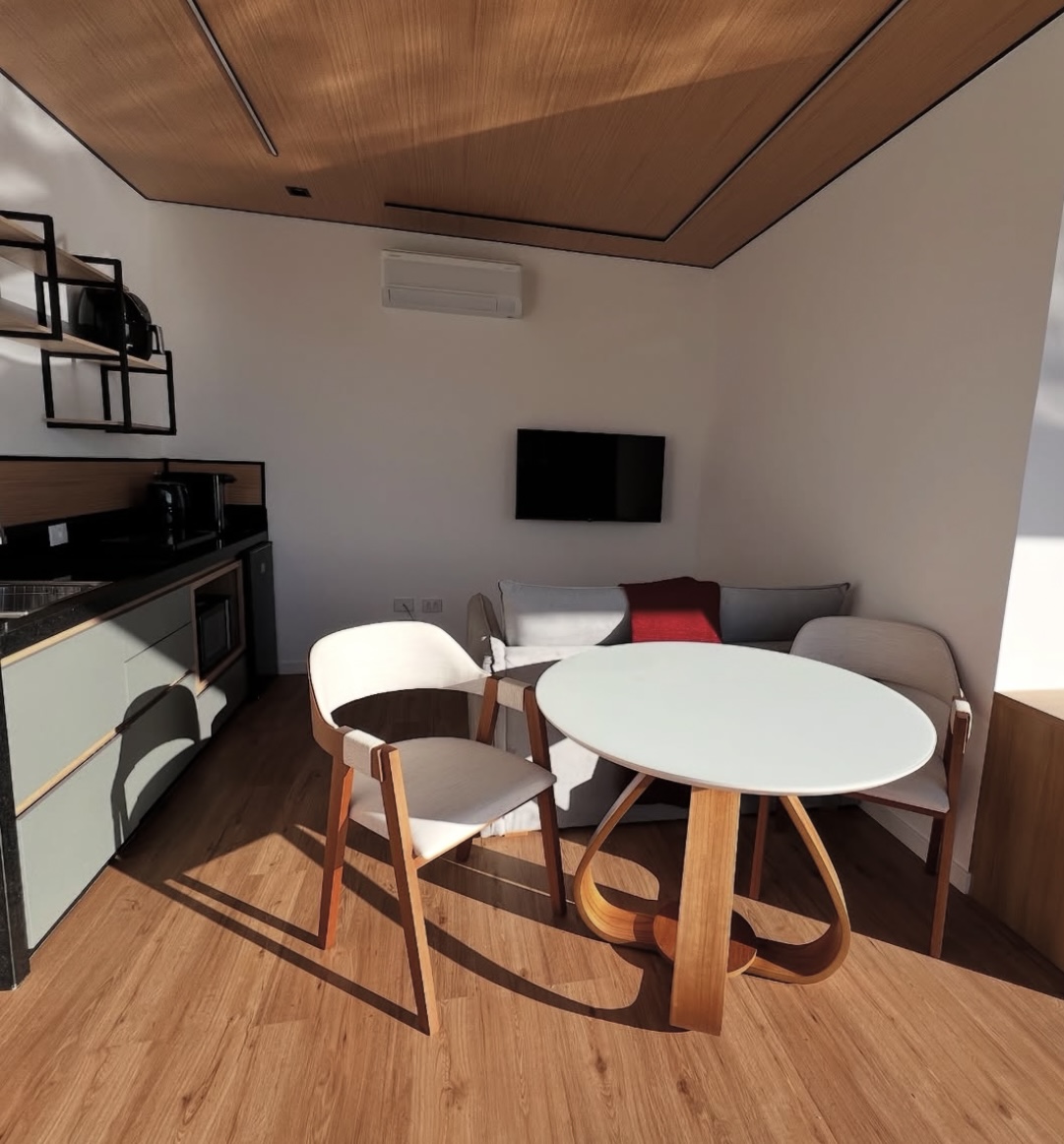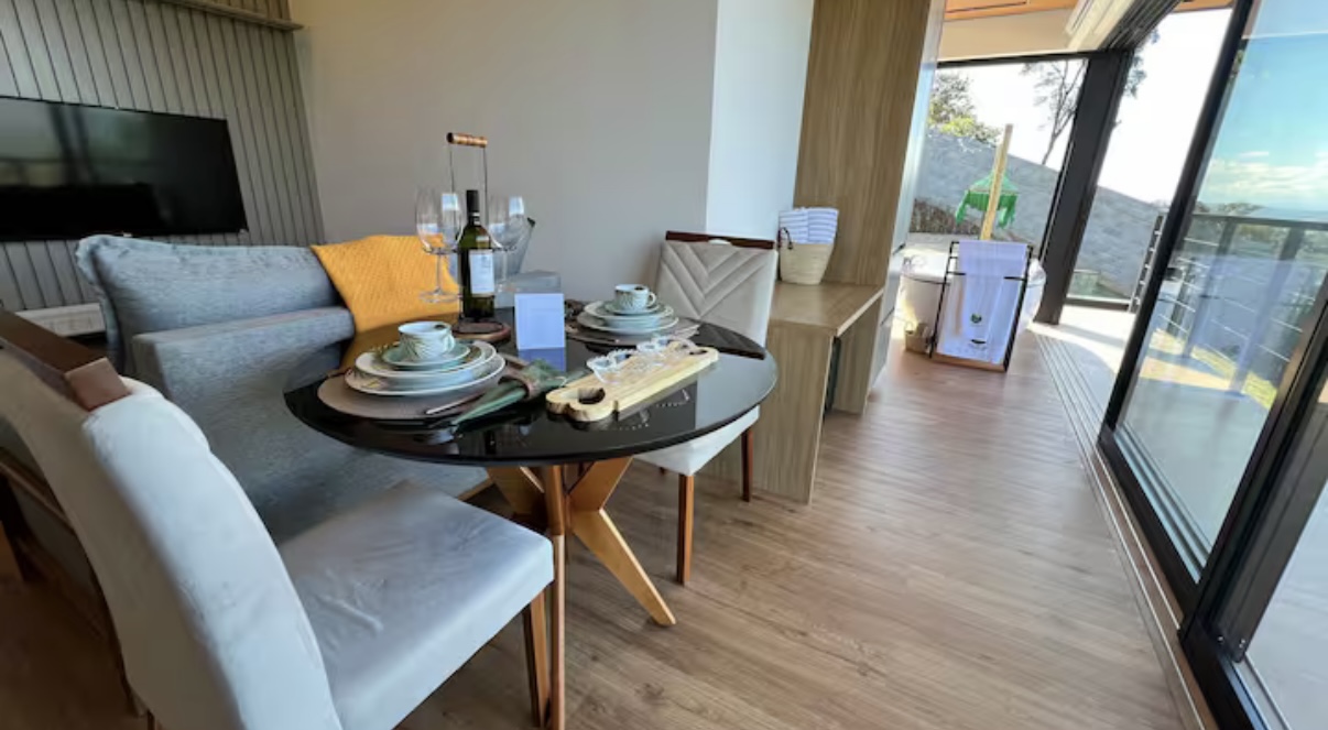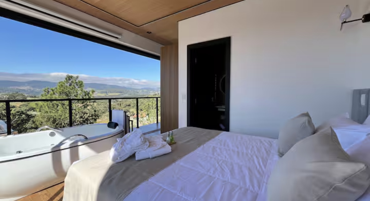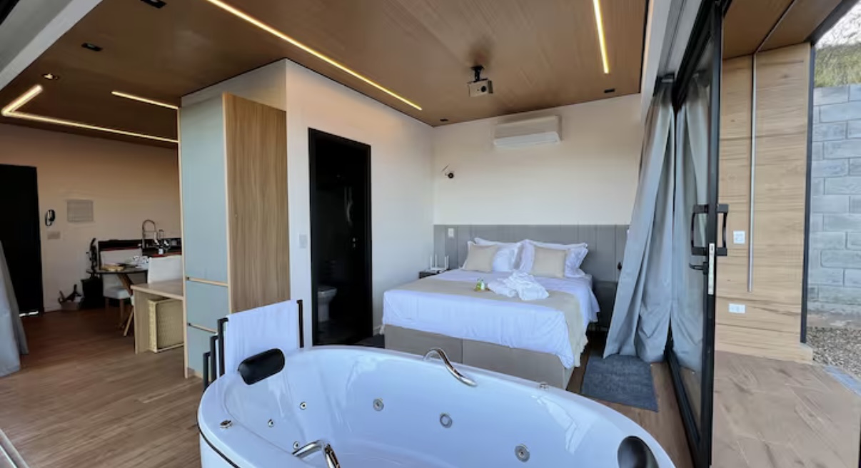 Internamente, o espaço dispõe de cama king-size com colchão premium, cozinha equipada, ar-condicionado quente e frio, smart TV, projetor com tela automática, sofá-cama, cortinas blackout, amenities e enxoval completo. A cabana é pet friendly para animais de pequeno porte e oferece acesso exclusivo controlado por senha. Por estar em área elevada, o acesso exige subir uma escadaria, sendo mais adequado para hóspedes sem limitações de mobilidade. Uma experiência única para quem busca conforto, charme e conexão com a natureza em um cenário impressionante.