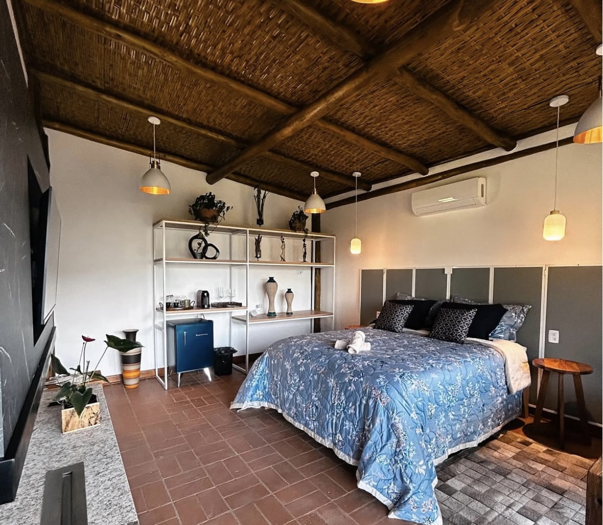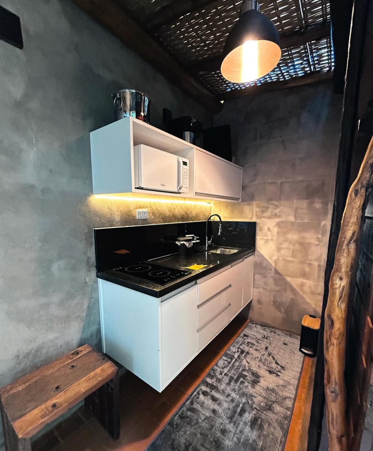 Espaço privativo para casal, cozinha completa, máquina de café, banheira com hidro, lareira ecológica, lareira externa, ar quente e frio, frigobar, roupas de cama, mesa e banho completo .