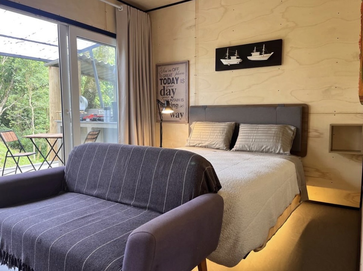São 3 acomodações, a menor com capacidade para 2 pessoas e a maior, 5 pessoas