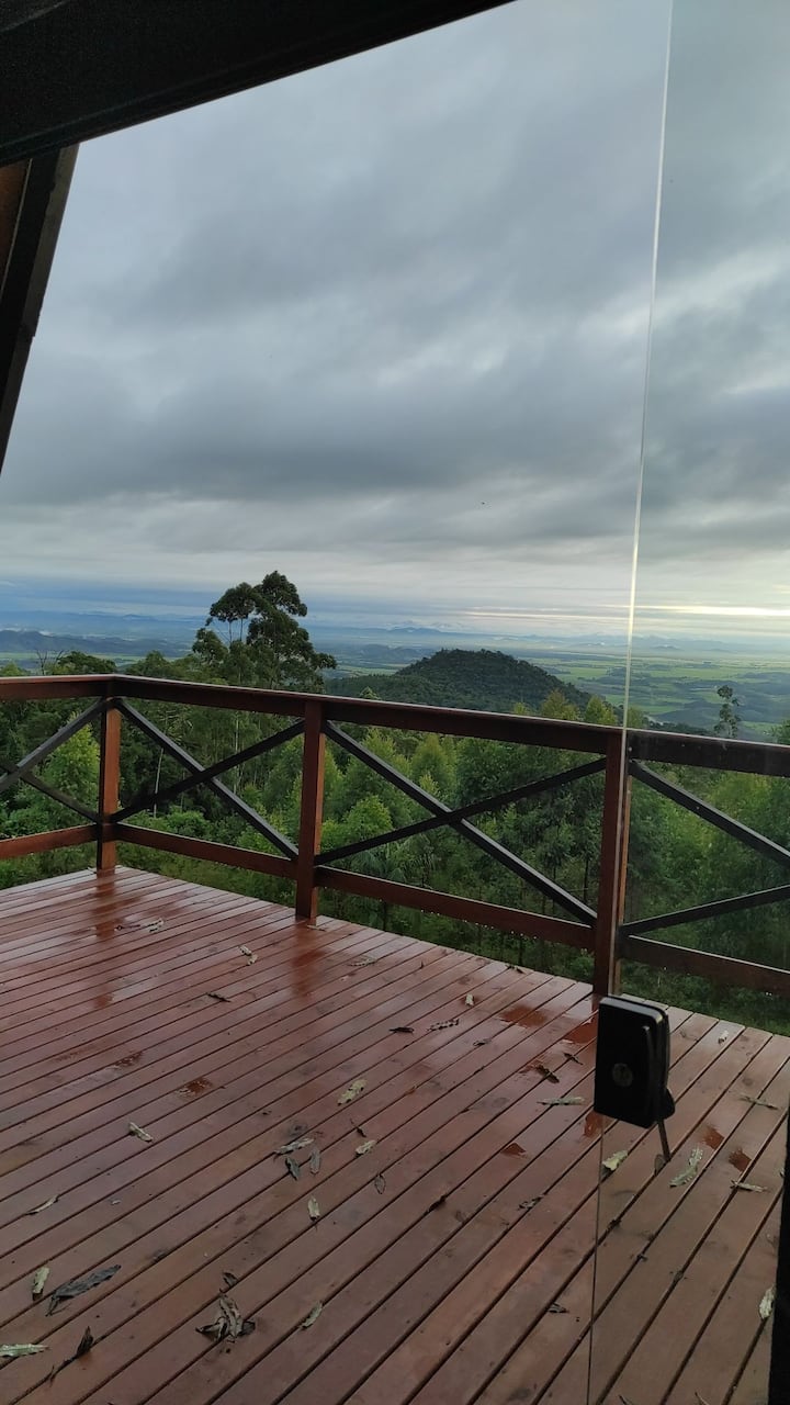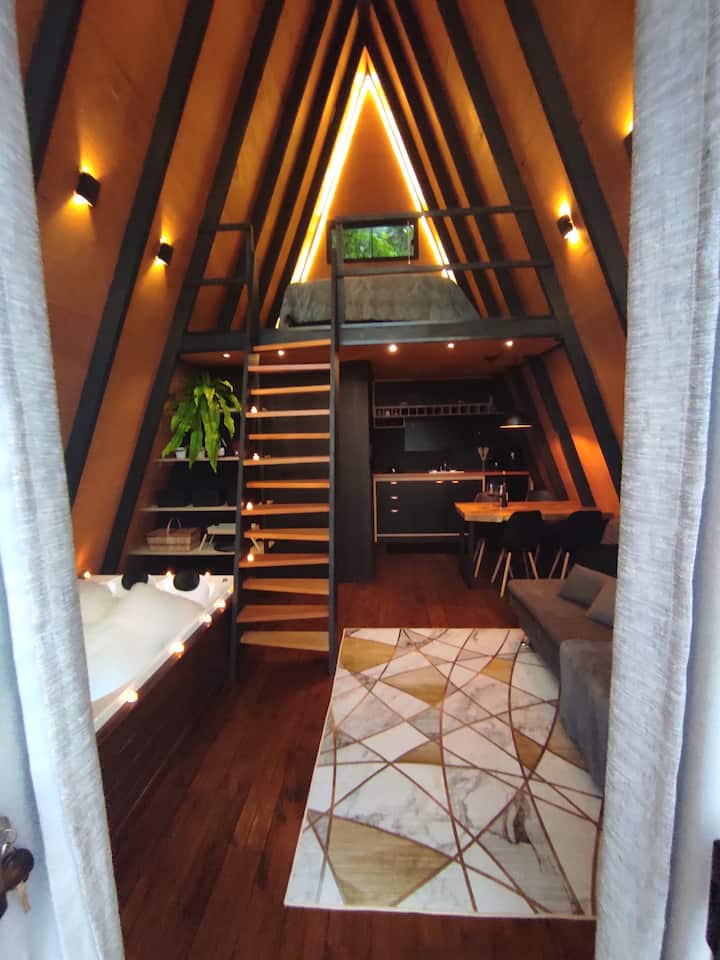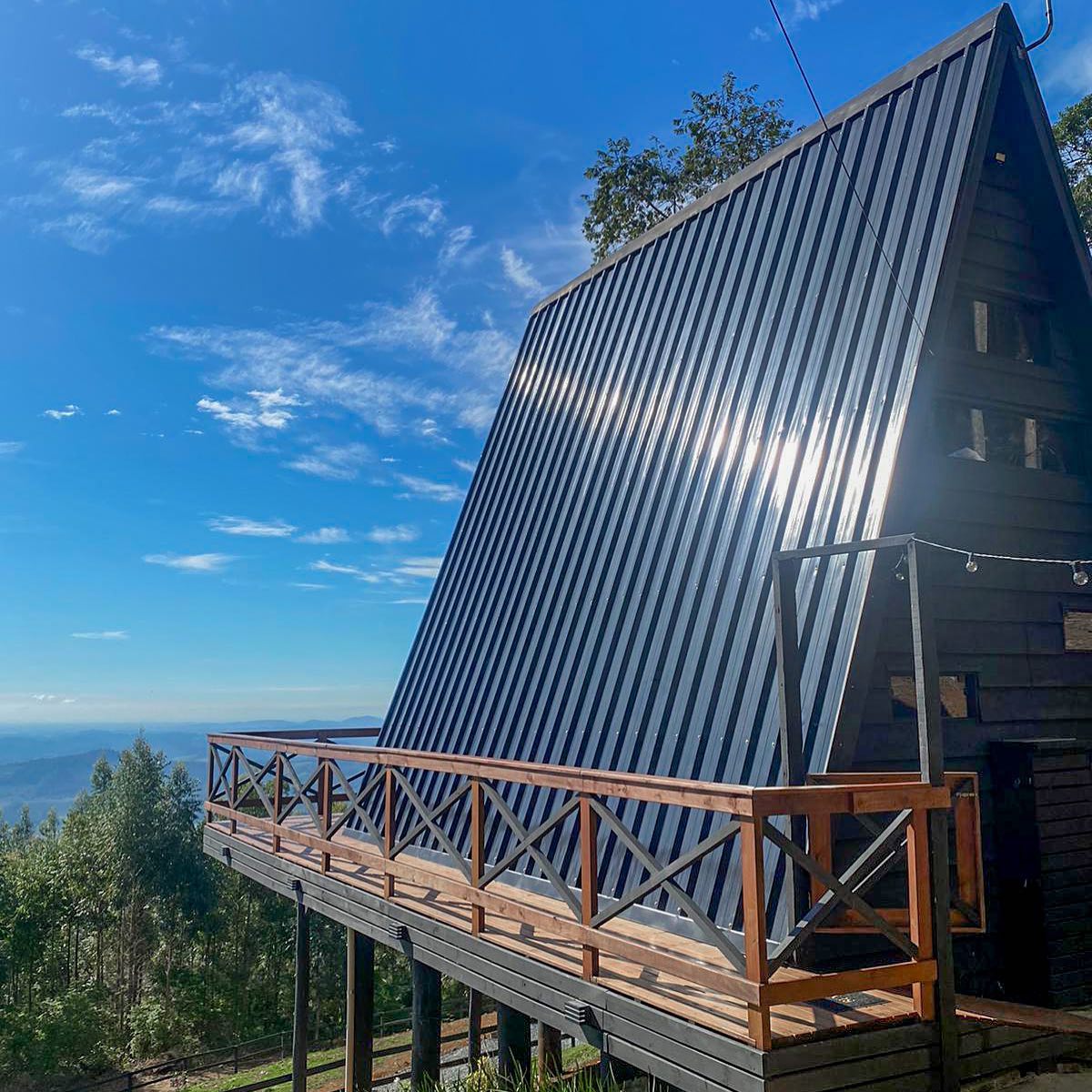 A cabana em estilo A-frame foi construída com materiais da região e dispõe de cozinha completa, sala de estar com lareira a combustão, banheira de hidromassagem com vista para o vale e deck privativo com panorama aberto, que em dias claros permite avistar o mar. Cada detalhe foi pensado para oferecer uma experiência intimista, sofisticada e memorável em meio à natureza.