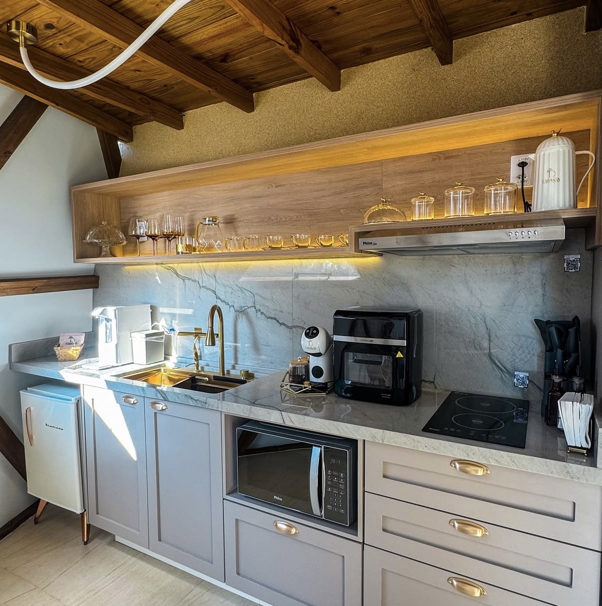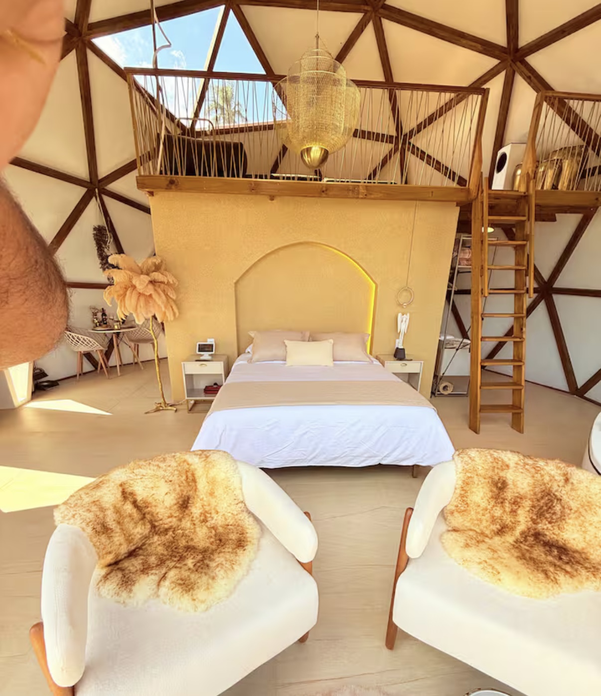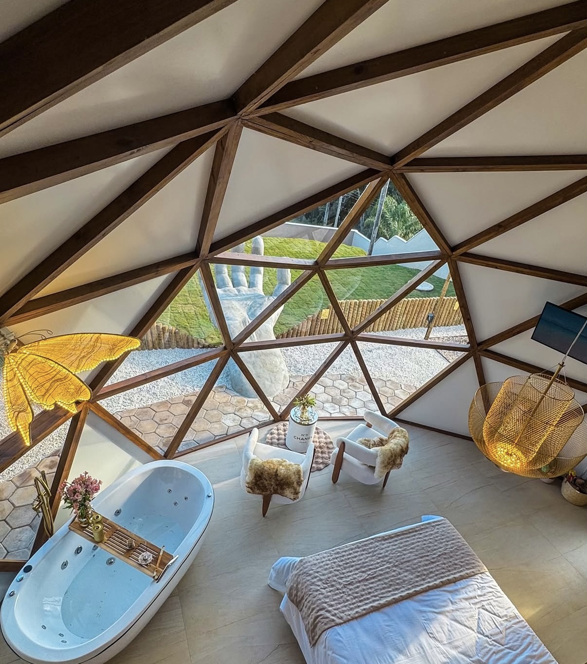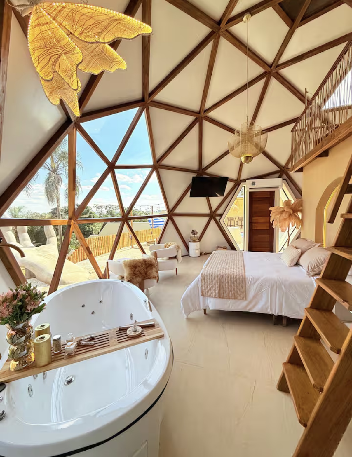 E por dentro? Cama confortável, banheira de hidromassagem, smart TV, cozinha completa e até uma ducha dupla no banheiro. *No andar de cima tem um sofá cama de frente para o céu! Sério, dá até para ver a lua!*