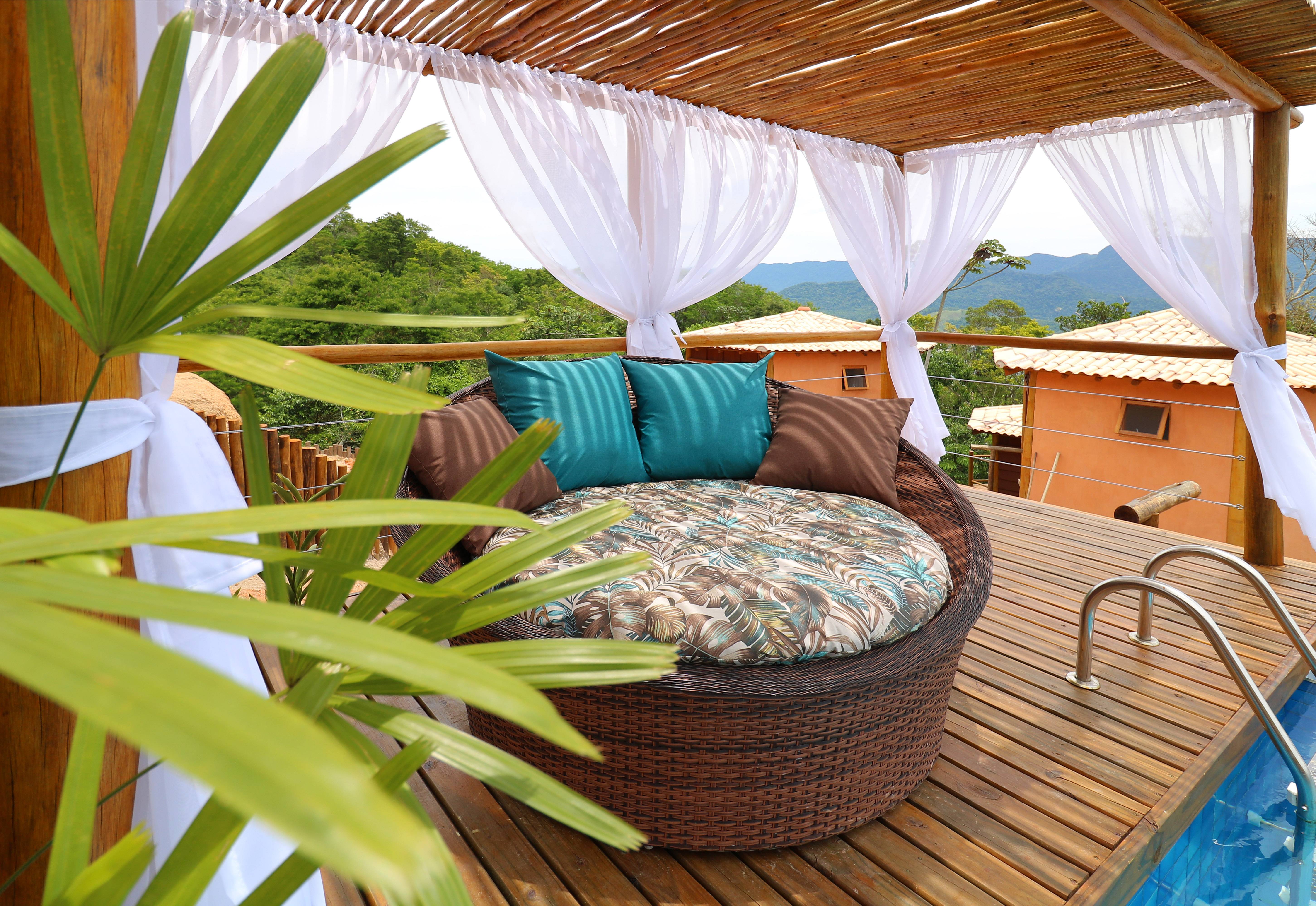 Os bangalôs acomodam até 4 pessoas com todo o conforto e praticidade. Cada unidade é equipada com uma TV de 50 polegadas, frigobar, ar-condicionado, secador de cabelo, roupas de cama e banho, além de toalhas para a piscina.