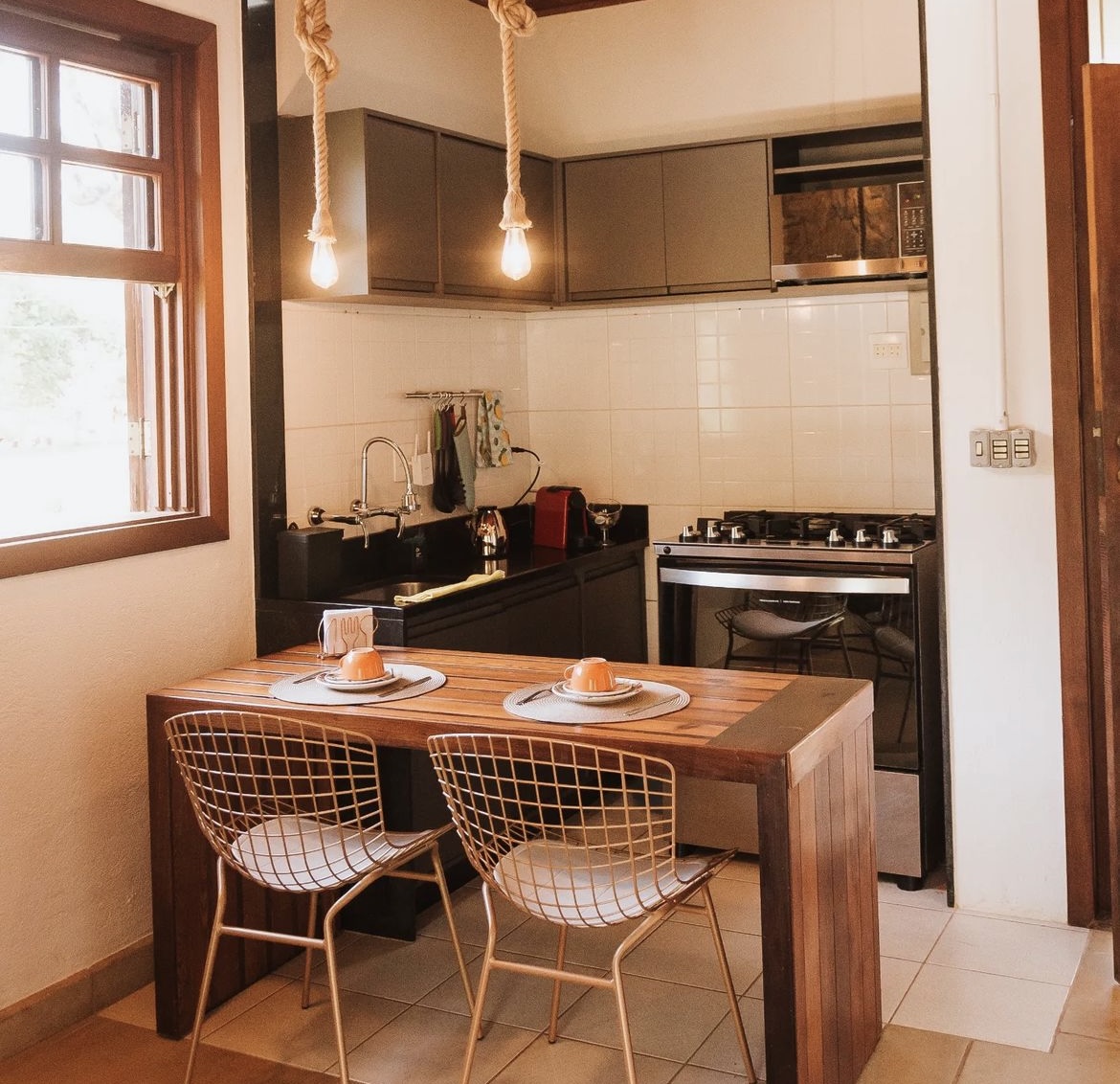 Os chalés oferecem uma estrutura completa que combina praticidade e aconchego. Desfrute da adega bem equipada e da cozinha completa, que inclui micro-ondas, geladeira, fogão de cinco bocas e forno. Para tornar suas refeições ainda mais agradáveis, você terá à disposição uma variedade de utensílios, como mixteira, liquidificador, espremedor de frutas, taças, copos, xícaras, colher de sorvete, facas, cervejeira, pratos, talheres, panelas e refratários.