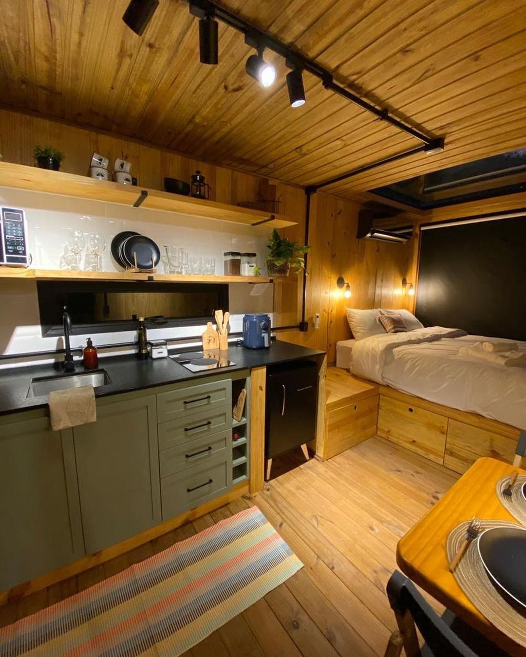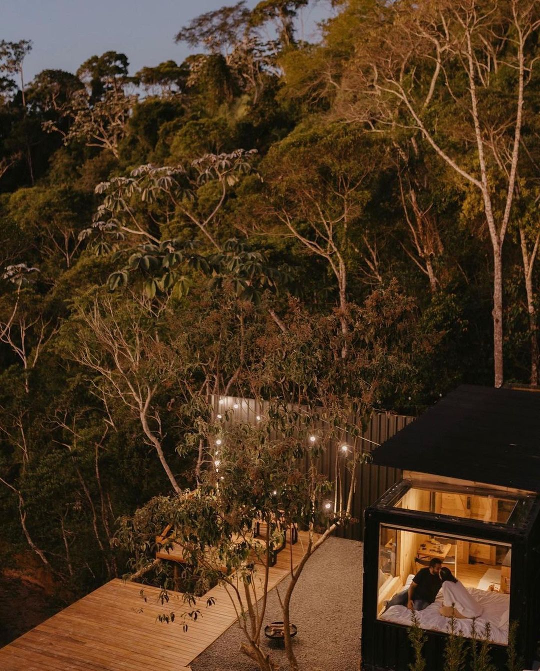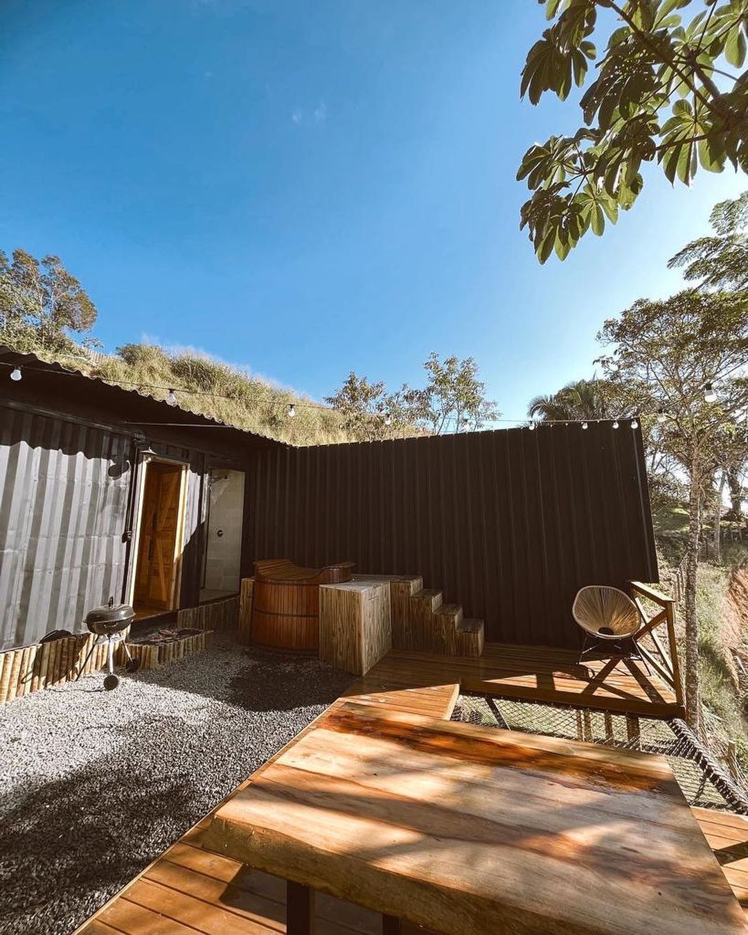 As cabanas são de estrutura de container marítimo e revestidas de madeira. Ambas as cabanas são ideais para 2 pessoas, mas 3 pessoas podem se acomodar facilmente.