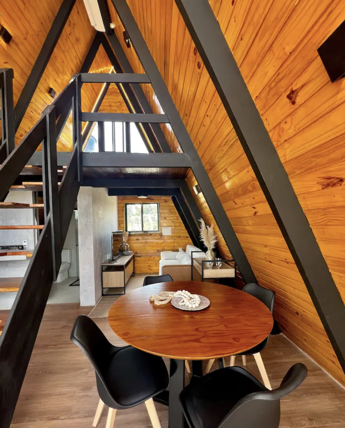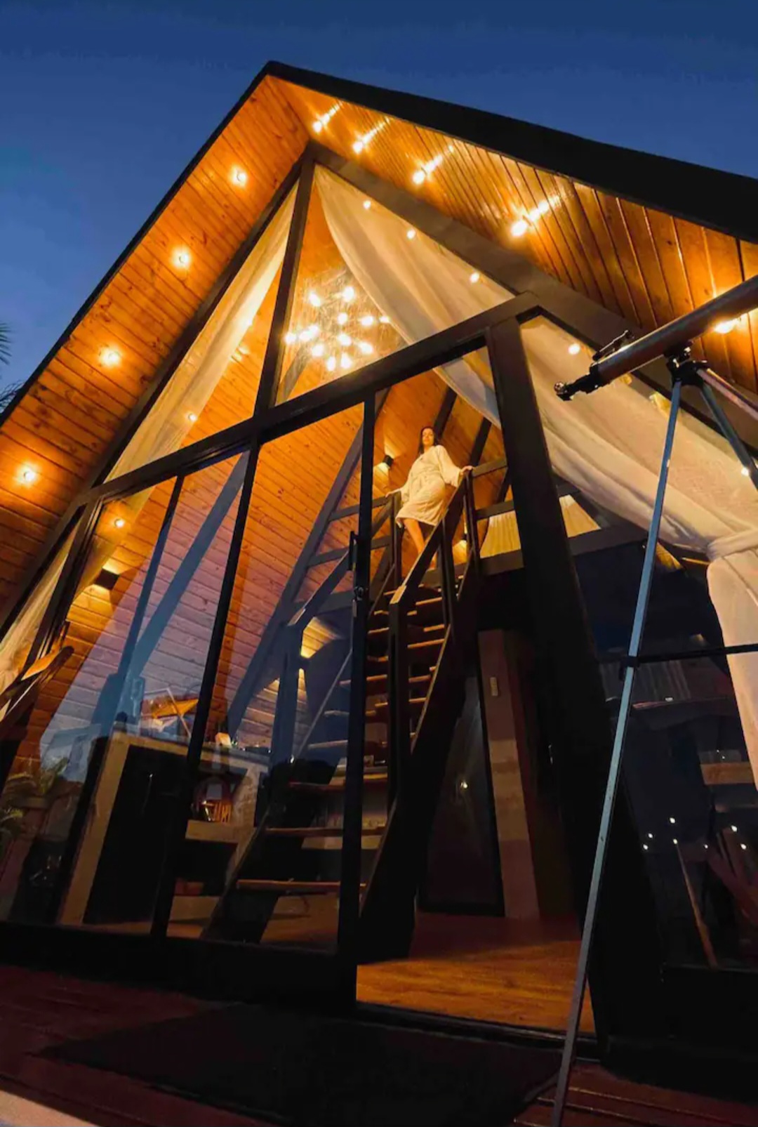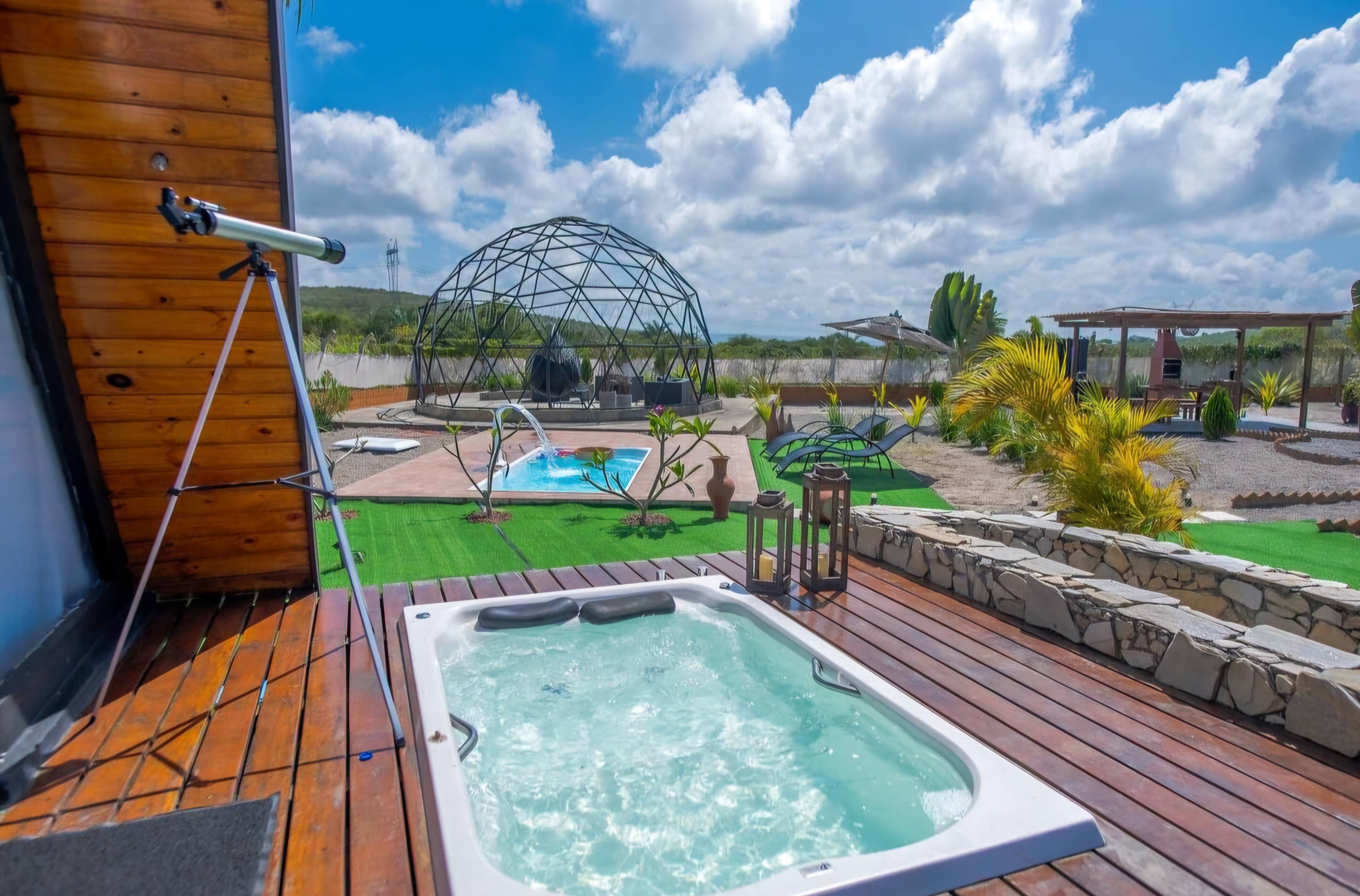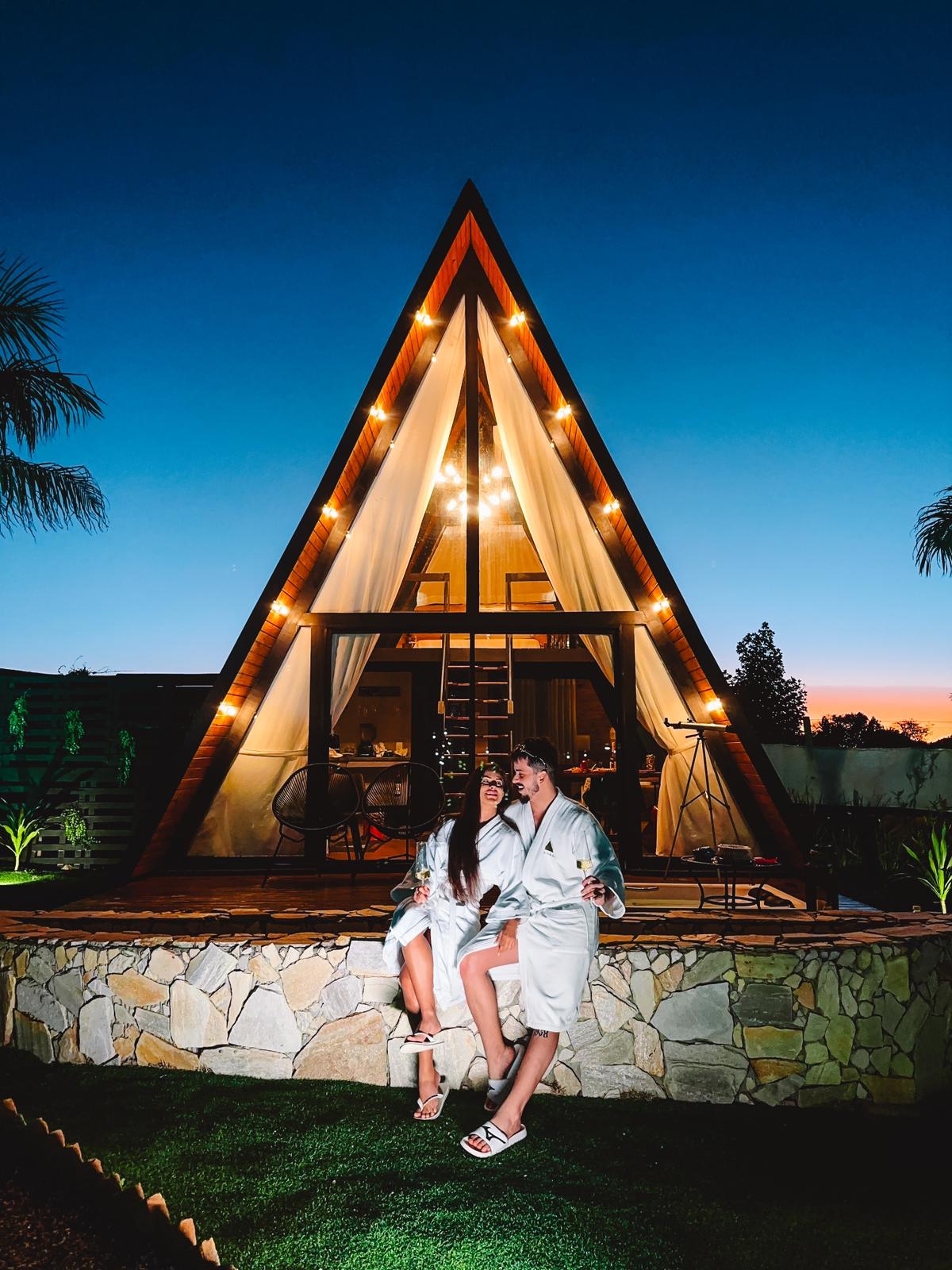 O local oferece uma experiência completa de lazer e conforto, com hidromassagem aquecida, piscina, lareira e área gourmet equipada com churrasqueira e utensílios necessários. Para momentos de descanso, um lounge (domo) com sofás e poltronas pingo, redário e playground estão disponíveis. A cozinha é totalmente equipada, e a sala de estar conta com mezanino, cama queen, ar-condicionado e TV 4K de 50” com canais, filmes e séries liberados, além de Alexa e caixa de som Bluetooth. A estrutura também conta com Wi-Fi em todas as áreas e água quente em todos os pontos. Para conveniência, há estação de carregamento para carros elétricos.
