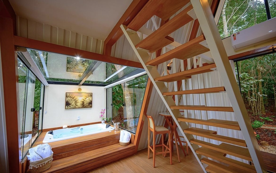 A decoração da Cabana Zurique é meticulosamente planejada para proporcionar um ambiente sofisticado e confortável. Acomode-se em uma cama de casal no mezanino, com roupa de cama de fio 300 egípcio, e desfrute de toalhas e roupões de alta qualidade. O espaço é equipado com smart TV e ar condicionado para seu máximo conforto.