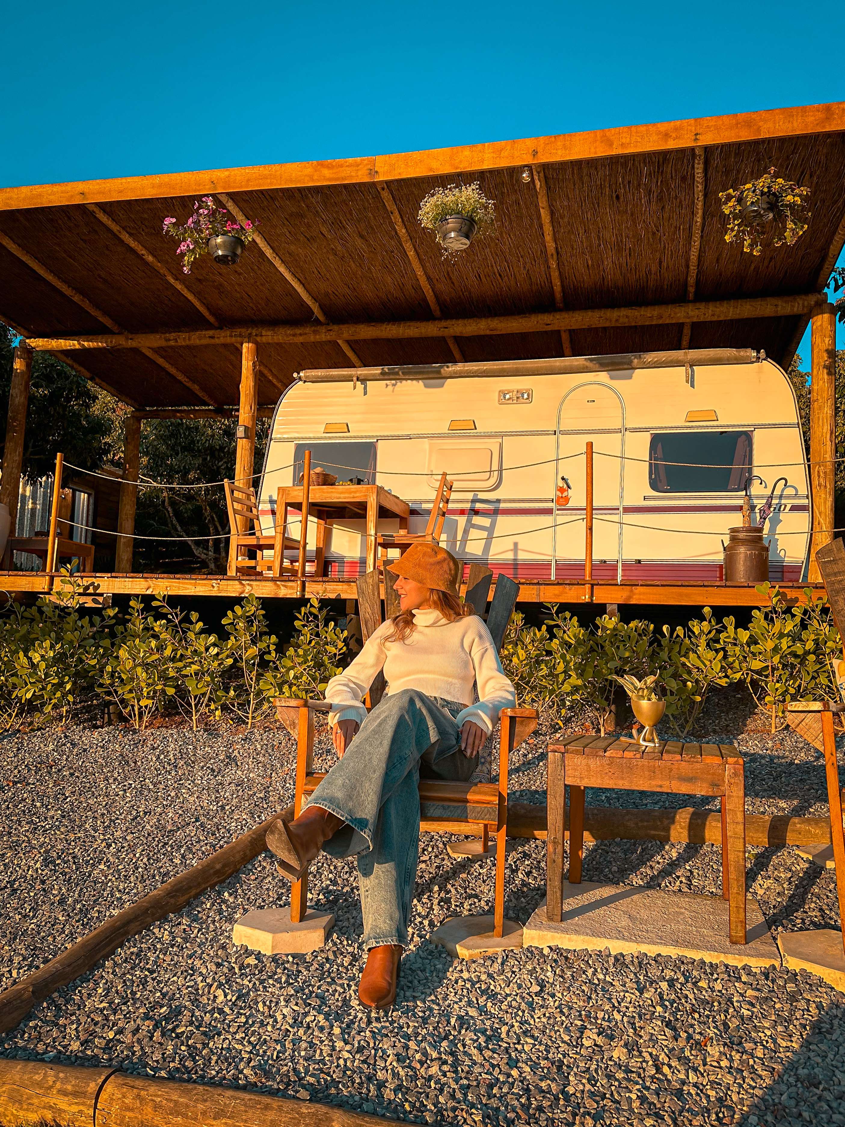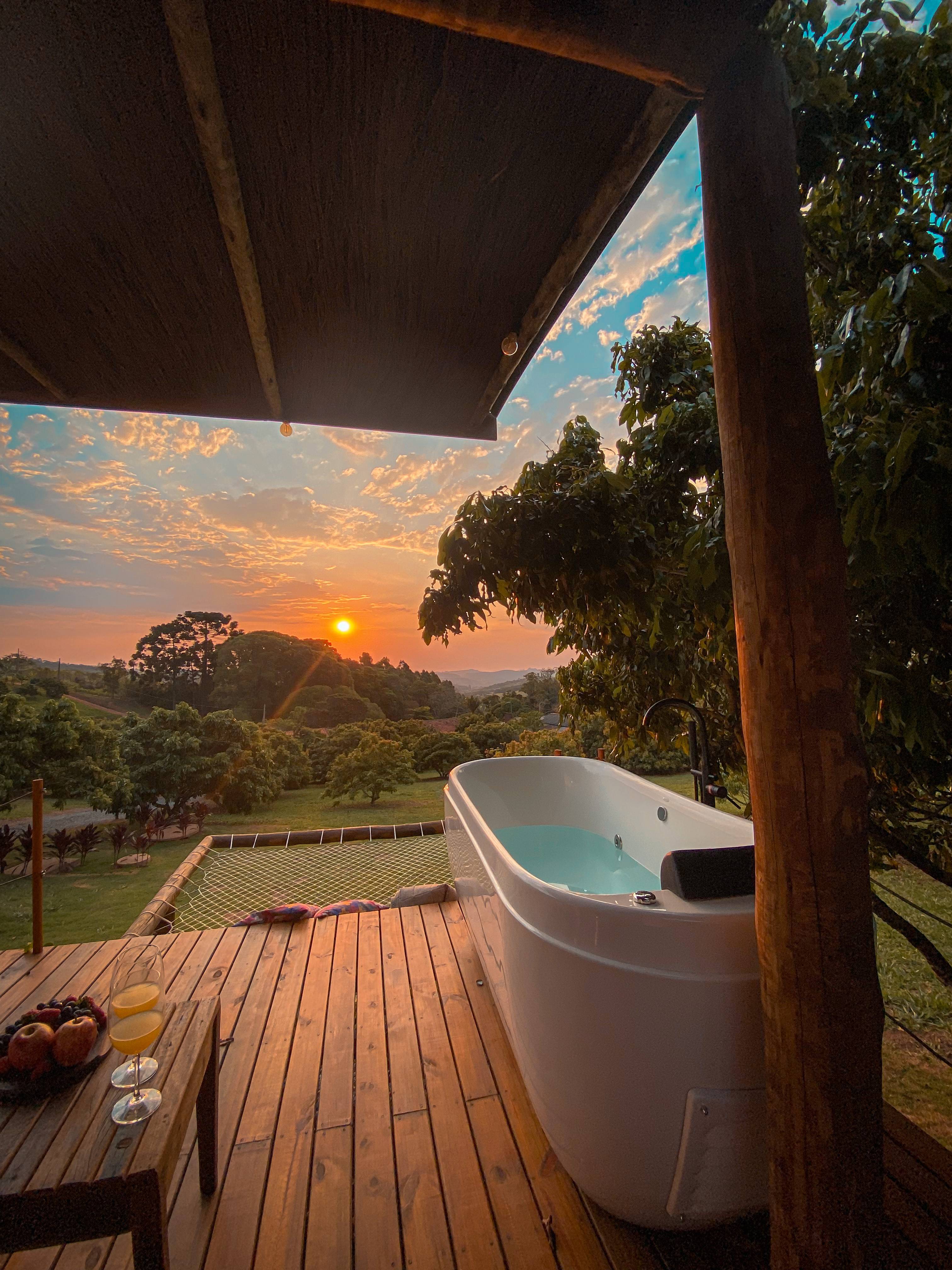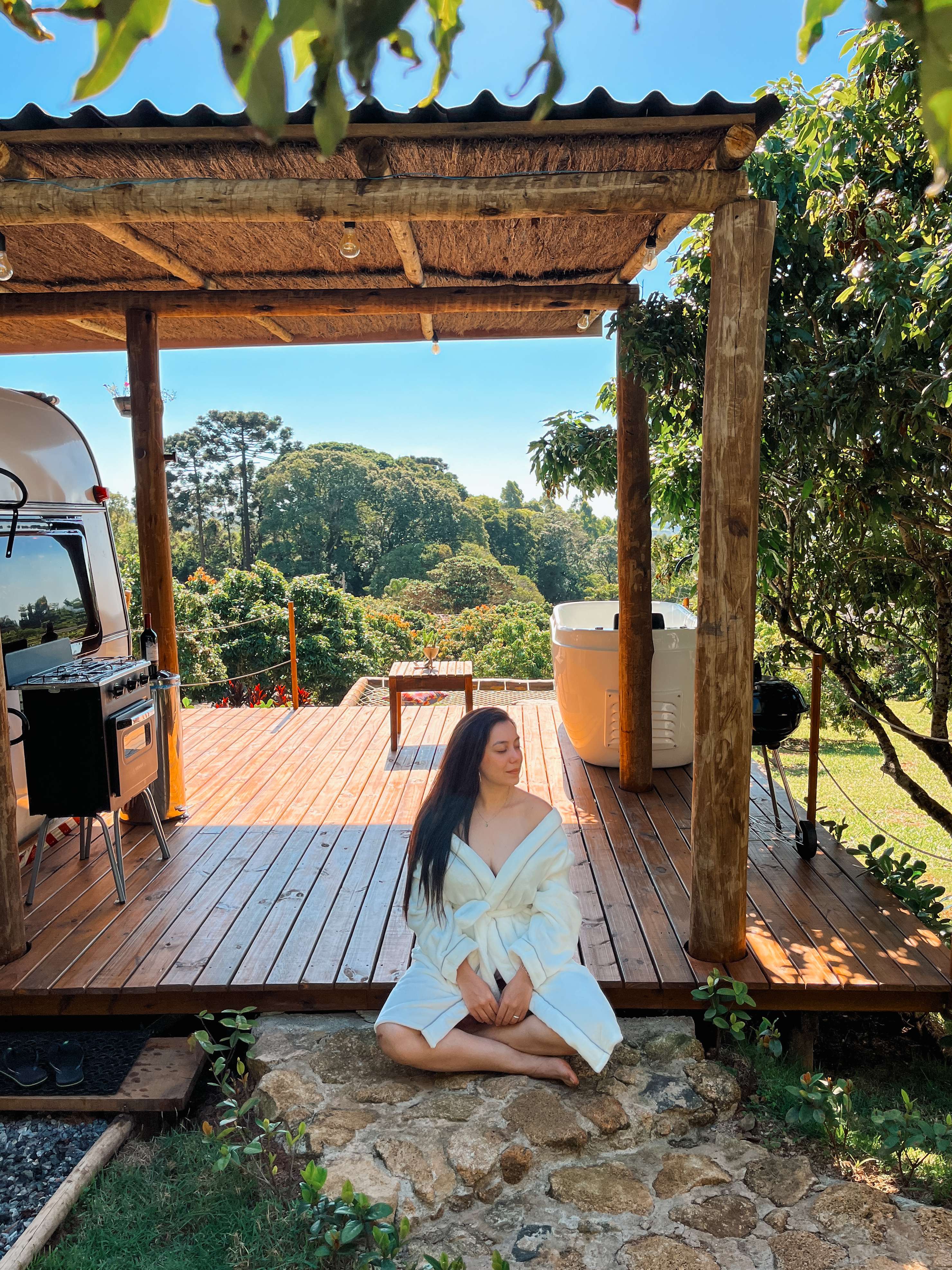 Trailer: A acomodação no trailer foi pensada para proporcionar experiências e momentos inesquecíveis para os hóspedes. O trailer está equipado com cama, mesa, armários, cozinha e banheiro, além de muitos acessórios e utensílios. Na parte externa, há um deck com banheira, mesa com 2 cadeiras, churrasqueira portátil e um fogão com forno a gás. Há também um banheiro externo com detalhes em vidro onde os hóspedes têm uma vista para a natureza, mas com privacidade.