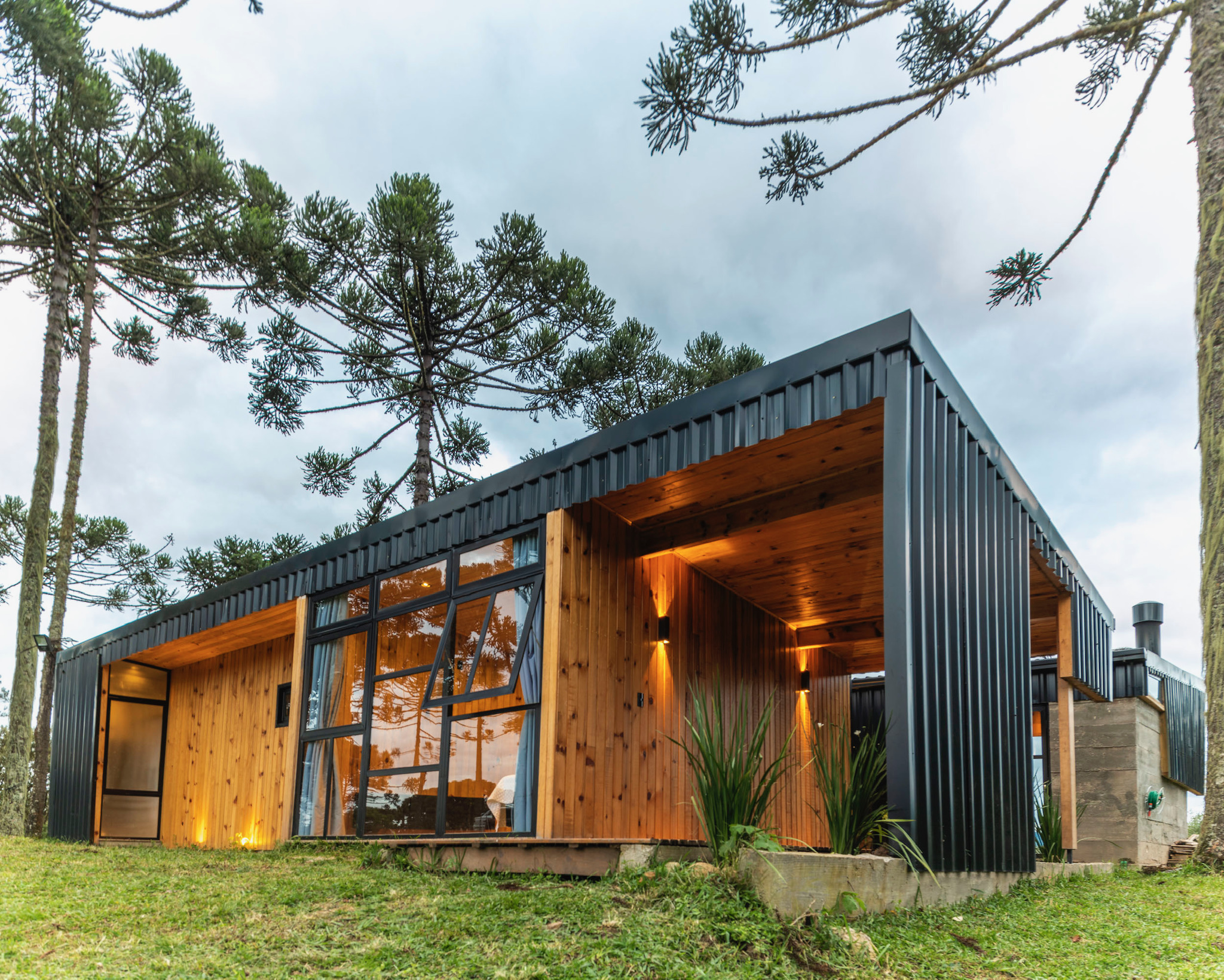Já a Casa Araucária é ideal para famílias ou grupos de amigos que desejam conforto aliado à natureza. Com capacidade para até quatro pessoas, conta com suíte equipada com cama queen, quarto com duas camas de solteiro, lareira, ampla sala e cozinha completa. O espaço oferece banheira de imersão, sofá para até cinco pessoas, churrasqueira e um amplo deck com fogo no chão, perfeito para reunir e criar memórias especiais.